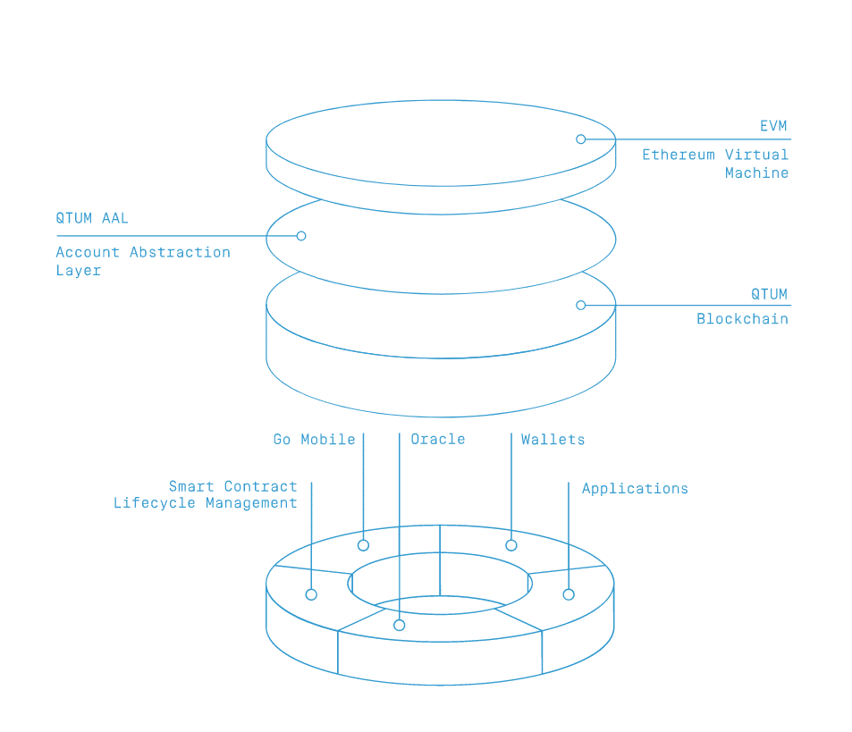 Qtum is a hybrid of Ethereum and Bitcoin technologies that ensures both security and flexibility. In addition to EVM and Qtum blockchain, there is an Account Abstraction Layer (AAL) with QTUM tokens that serves as an intermediary between the two technologies.
