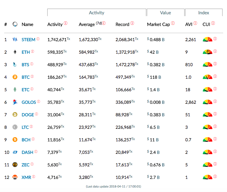 Taking into account Bitcoin’s pure currency nature, its fourth place entry in the activity ranking proves its popularity and usefulness. For instance, blockchains in Steem and Ethereum are responsible for each small change in the application running on them. In Bitcoin, all of the transactions are financial. Needless to say, Bitcoin is here to stay.